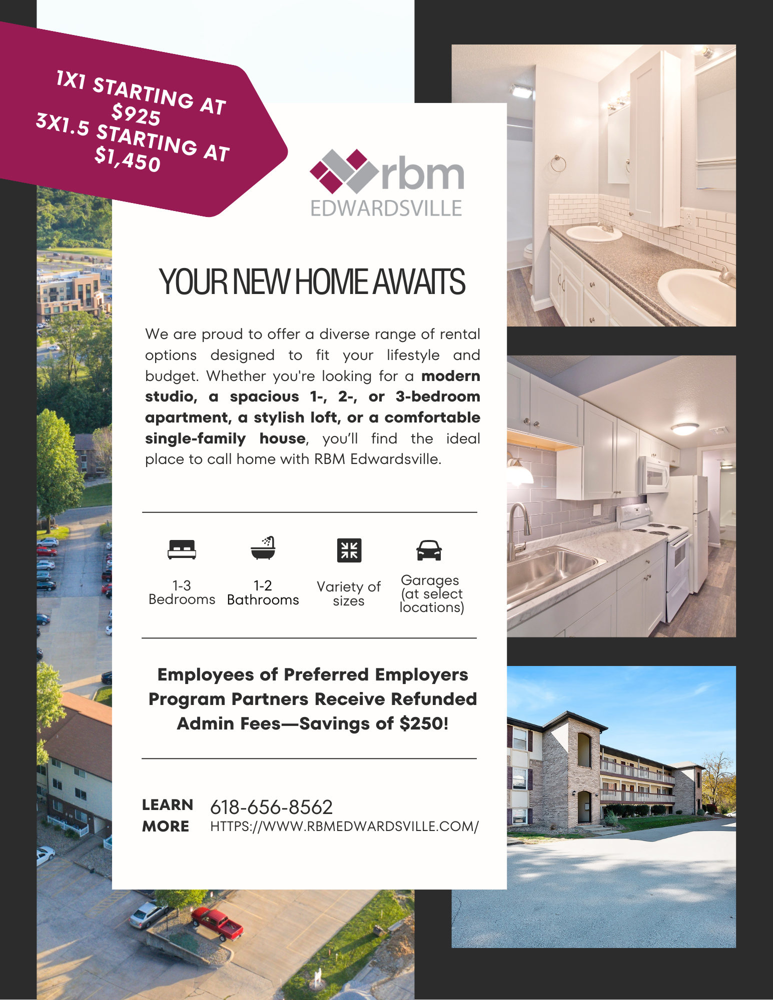 RBM offers housing to fit every lifestyle and budget. Choose from more than 1,400 apartments in the Edwardsville, Glen Carbon and St. Louis area, and explore any option from studio, 1-, 2-, and 3-bedroom apartments, to lofts, townhomes and single-family homes.